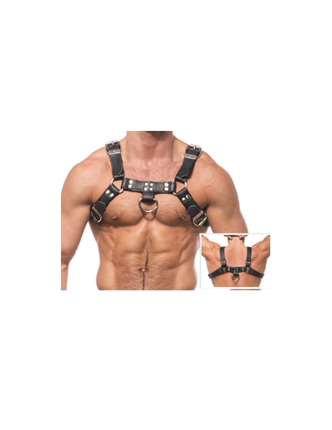 Dieser verlockende Brustgurt umhüllt Ihren Partner mit Leder und Metall für einen aufregenden Look und ein exotisches Gefühl.