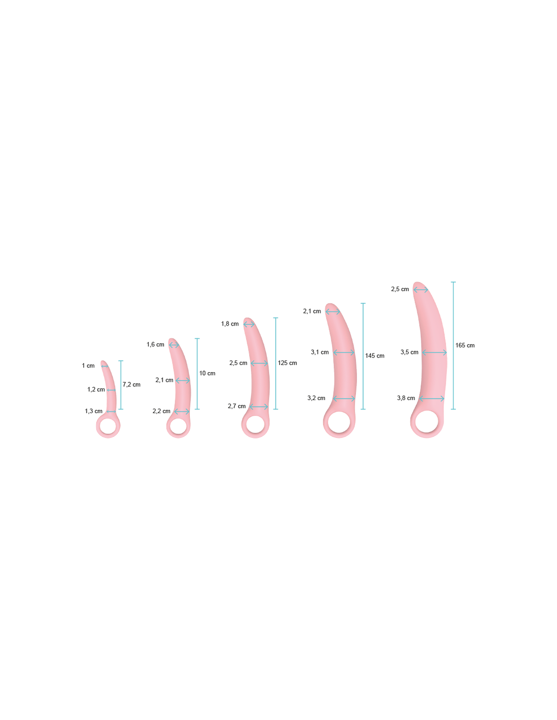 Das elegante Set enthält 5 Dilatatoren, deren Größe für eine schrittweise Erweiterung variiert. Sie sind dank der Fingerschlaufe einfach zu bedienen und eignen sich perfekt für Frauen mit Problemen im Zusammenhang mit der intimen Passform. Das Set besteht aus hochwertigem Silikon und wird in einer geschmackvollen, zeitgemäßen Verpackung geliefert.