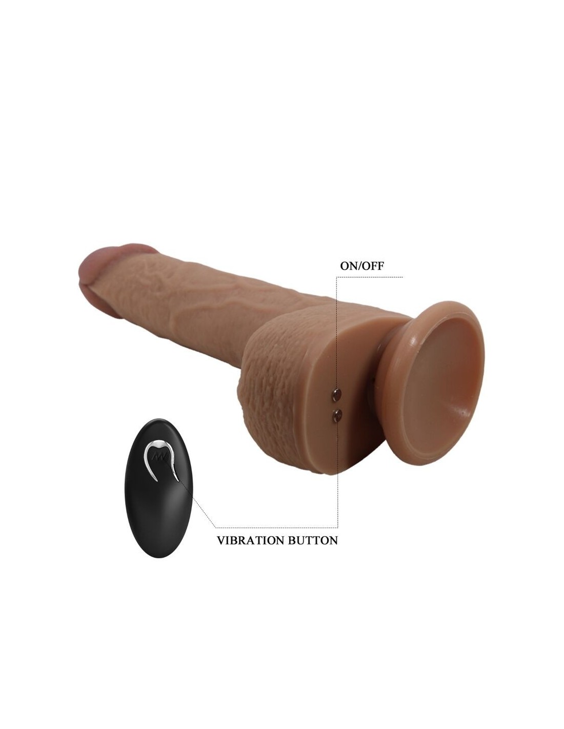 A realistic penis shaped thrusting and vibrating vibrator with a strong suction cup that sticks to any smooth surface. The suction cup makes hands-free fun possible.