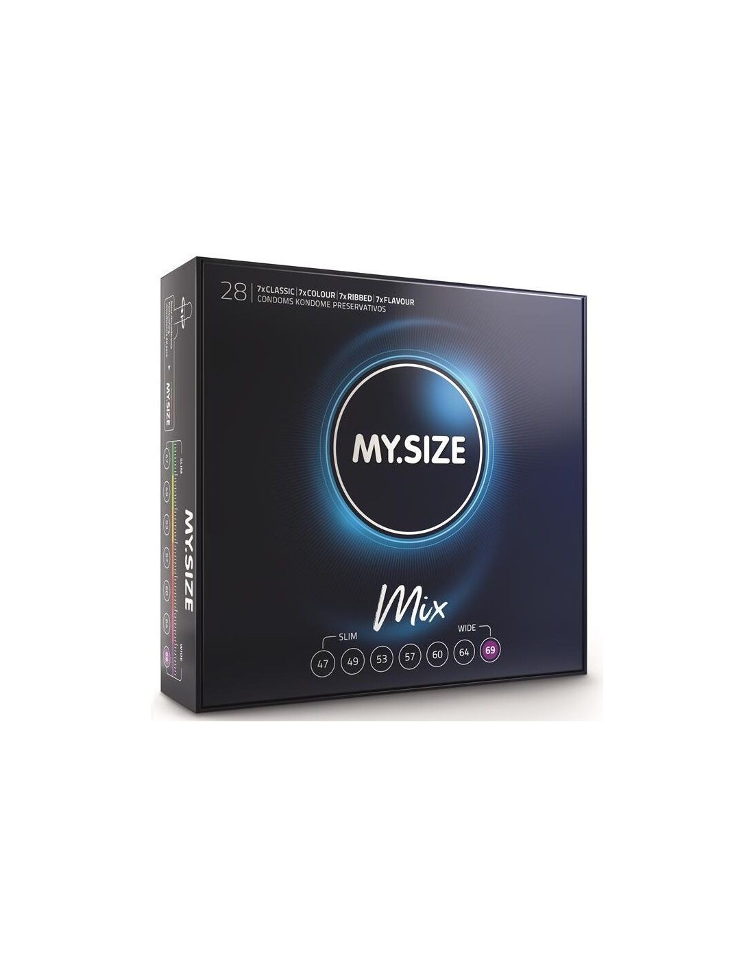 EL TRATO: 28 preservativos de MY.SIZE en 4 variaciones: 7 Classic clásicos, 7 Ribbed acanalados, 7 Flavour con sabor, 7 Colour de colores. 69 mm. Marcado CE. En cumplimiento de la Directiva de la UE 93/42/CEE relativa a los productos sanitarios. Disponible en otros anchos nominales. Incluye aplicación de medida gratuita en línea.