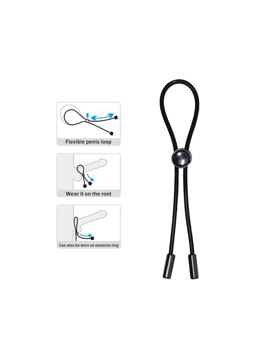La boucle du pénis est attachée. Il est contrôlé par une perle synthétique afin de pouvoir être placé sur le pénis et les testicules. Vous pouvez ajuster individuellement le diamètre à la taille du pénis. De cette manière, l'intensité de l'effet de restriction du flux sanguin peut être ajustée selon les souhaits personnels.