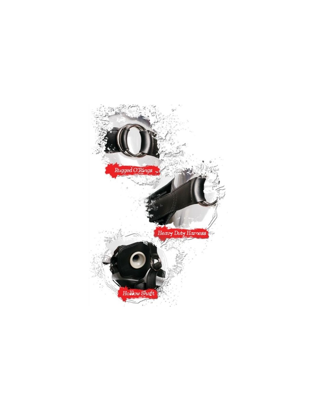 La comoda imbracatura in pelle si adatta facilmente alla maggior parte delle taglie, mentre i resistenti O-ring in metallo tengono tutto insieme. Un lungo tubo di plastica cavo, che misura 1,5 pollici di diametro, è posizionato all'interno del dong di gomma, rendendolo perfetto per entrambi i sessi.