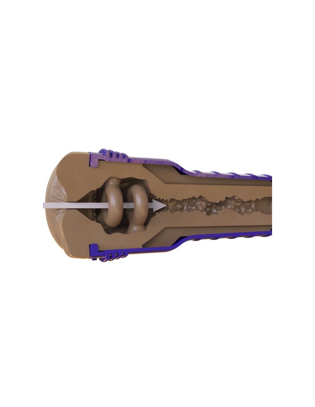 Após esse recurso, um cone com nervuras invertido leva você mais fundo em um beco anal sinuoso revestido por um aglomerado de protuberâncias densas e muito intensas projetadas para acariciar sua ereção com perfeição.