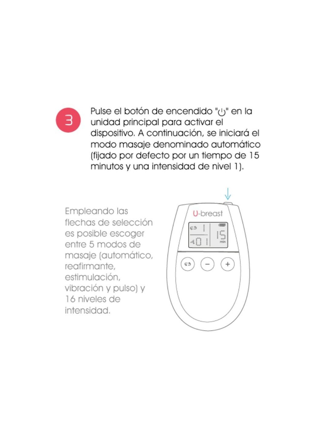 U-breast é responsável por estimular a circulação mamária graças às suas duas unidades eletromagnéticas que reativam a renovação celular e a produção de hormônios através da massagem para aumentar o tamanho dos seios e obter maior firmeza. A intensidade da eletroestimulação penetra na pele melhorando a circulação sanguínea através de 5 modos diferentes e 16 níveis de intensidade com os quais aumentará o seu peito sem sair de casa e de forma totalmente natural. Todo o processo de estimulação é acompanhado pelo U-breast Gel, que ajuda as ondas a penetrarem de forma mais eficaz na pele durante a transmissão das ondas.