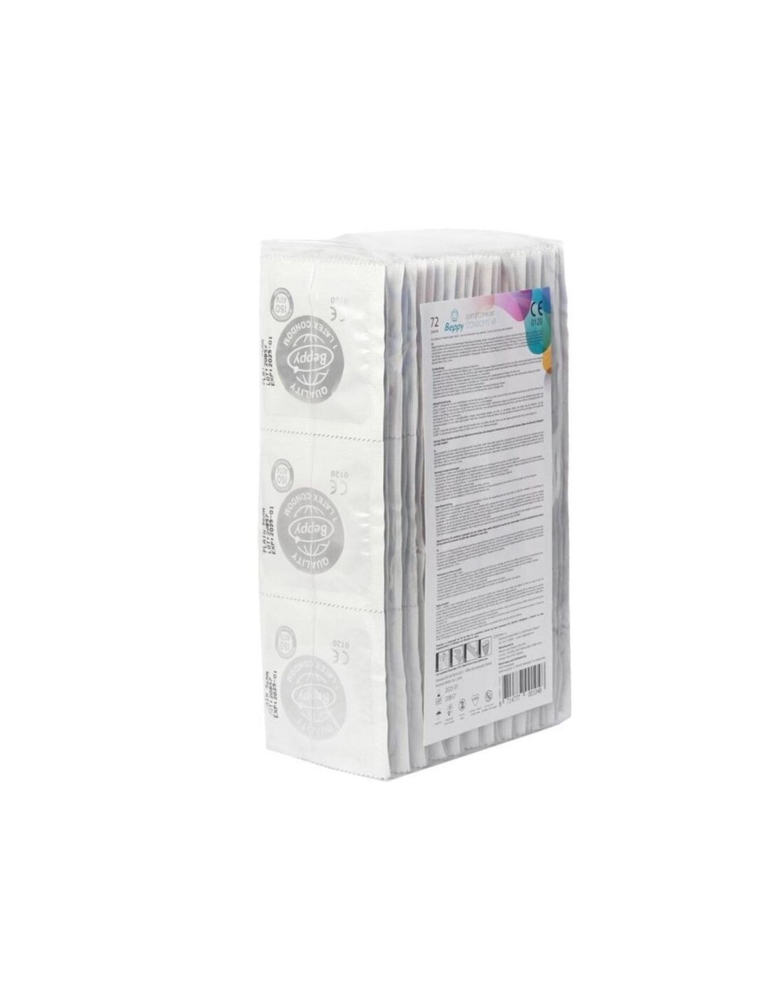 Os preservativos Beppy são ligeiramente maiores do que os preservativos normais e não têm odor desagradável de látex. Os preservativos Beppy são feitos de látex de borracha natural e oferecem excelente proteção. Eles são fornecidos com um reservatório e contêm um lubrificante de silicone não espermicida.
